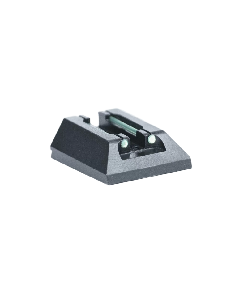 Feita em aço ferramenta, com 6mm de altura, desta forma, é recomendado que o cliente antes de confirmar a compra meça a sua mira original para ver se enquadrará a altura com a nossa mira, caso a altura não seja compatível, recomendamos que seja trocado a maça e a alça de mira originais por miras da Visão. A peça vai instalada com fibra verde de 1mm que promove um aumento da velocidade de enquadramento do alvo.